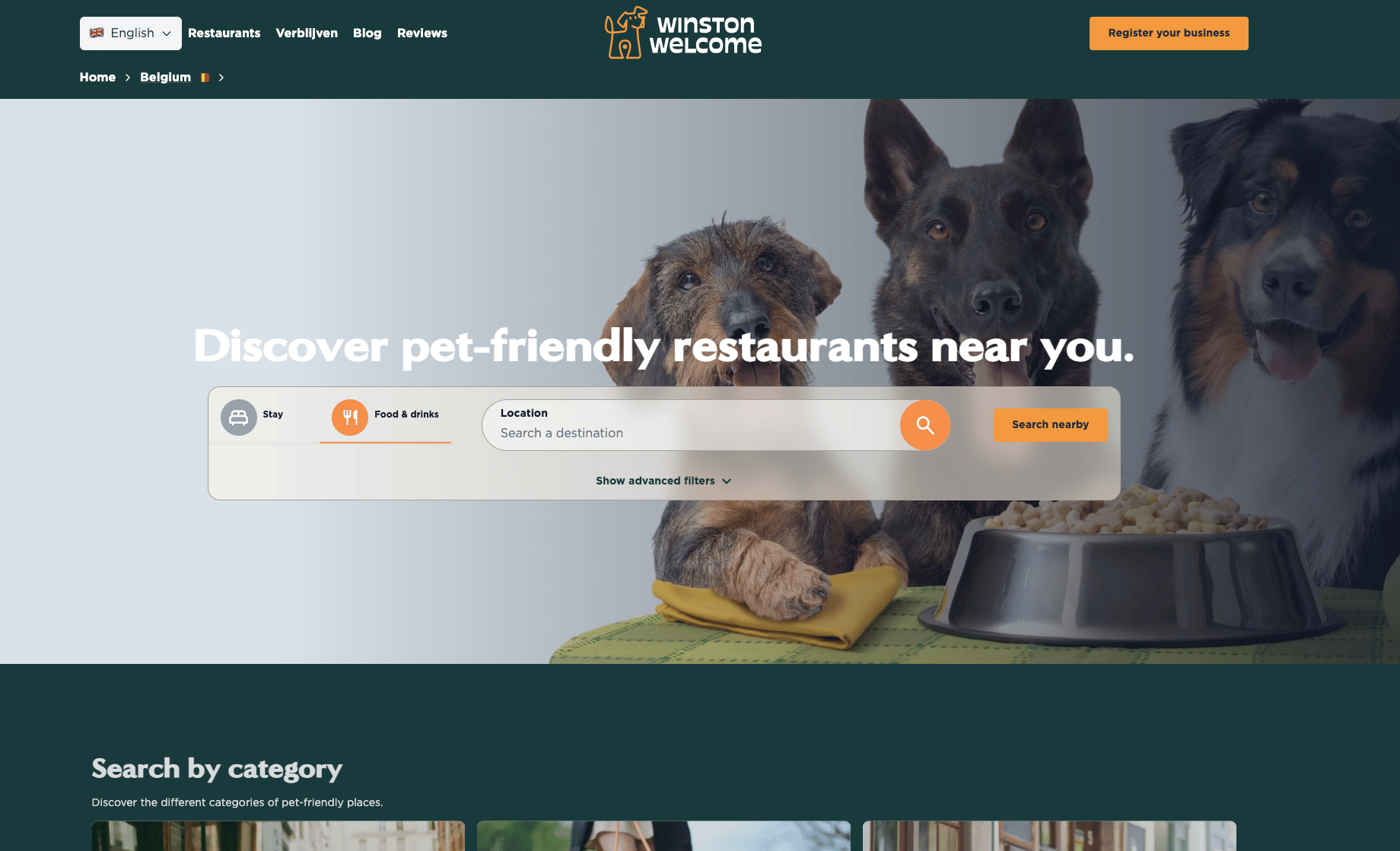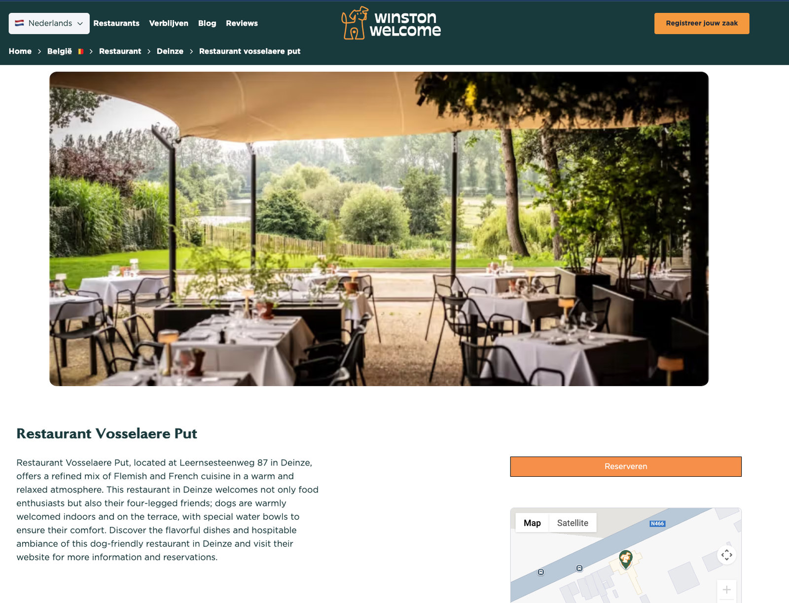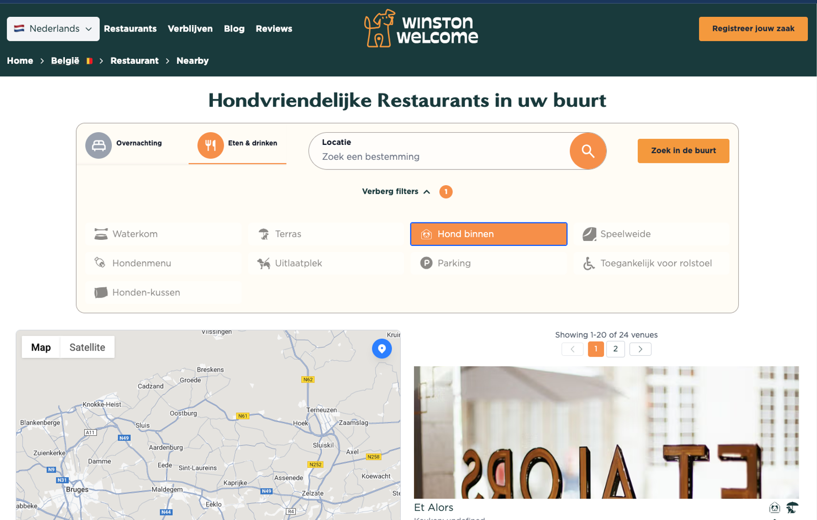 - Functionaliteit: Horecazaken worden weergegeven in een duidelijke directory met filters op stad, type zaak en voorzieningen (denk aan waterbak, hondenkussen of zelfs een speciaal menu).